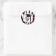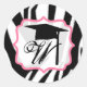 A sticker featuring a black and white zebra print background. Illustration of a black graduation cap inside pink bracket frame. Personalise with the letter of your initial. Look for matching invitations at Jill's Paperie.