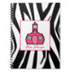 A spiral notebook featuring a black and white zebra print design. Pink Schoolhouse inside square at centre. Personalise with your name.