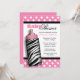 Stylish Baby Shower invitations designed with white polka dots over pink, and featuring a zebra print baby bottle.