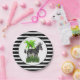 This zebra paper plate will coordinate with a jungle theme party. The plate features a black and white striped background with an illustration of Zebra and palm tree in the centre with a white background.