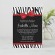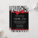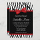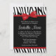 A trendy black and white zebra pattern with a red bow graphic is featured on this fun Bat Mitzvah invitation.
