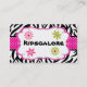 This is an adorable business card. It has black and white zebra stripes with a hot pink polka dot ribbon coming through the centre of the card. There's a white bubbled centre with four small flowers in the corners of the white centre. Check out the many other products with this design.
