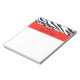 This is the perfect gift or just for you! It's a personalised notepad that has black and white zebra striped print along the top with a red thick stripe under it where you can personalise with your name. Check out the many other colours, designs and products in this line in our store.