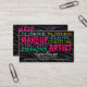 © 2015 Socialite Designs. Unique makeup artist and hair stylist business card with an all-text design and subtle grey and black zebra pattern background