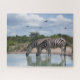 This Zebra Watering Hole jigsaw puzzle features a pair of zebras drinking water from a rare clear watering hole oasis somewhere in the African plains. The water reflects the blue skies with fluffy white clouds and a small flock of birds playfully flitting about overhead as well at the black and white striped zebras enjoying a drink of good clean water. The bright sunshine adds warmth to the green foliage in the landscape beyond. Nature lovers will adore this tranquil scene and would be excited about receiving this zebra puzzle as a special gift.