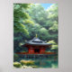 The beauty of a Japanese temple resting peacefully in the centre of a quiet pond can be seen in this digital artwork. A beautiful view is created by the thick, green forest behind it and the sky above. A glimpse of a calm universe that is out of our reach is provided by the temple's and the surrounding landscape's reflections in the pond's quiet waters. The elaborate architectural elements of the temple and the serene ambiance of the surrounds transport us to a place where peace rules supreme.