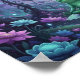 This fantasy poster features a Meditating frog on a lily pad in a glowing, purple-hued magical forest under an aurora and crescent moon-serene fantasy art with luminous flowers.
