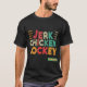 The t-shirt features "Jerk Chicken Jockey" in a bold, multicolored design. Each word could be a different colour, or the letters themselves could be a gradient of spicy reds, yellows, and oranges. Imagine flames licking up the letters "Jerk" to hint at the dish's heat, while "Chicken" is a cool green or blue. "Jockey" could be a playful font, perhaps reminiscent of jockey silks.