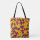This image is a vibrant geometric pattern composed of multicolored chevron (V-shaped) stripes and triangles arranged in a mosaic. The pattern features rich hues of yellow, orange, magenta, maroon, and olive green, creating a visually energetic and dynamic effect. The chevrons are orientated in various directions, with each square or rectangular section displaying its own combination of colour and angle, producing an overall sense of movement and complexity.