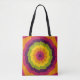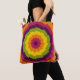 This image is a vibrant, abstract spiral featuring jagged, layered bands of colour radiating from the centre. The colours are bold and varied—purples, magentas, oranges, yellows, and green—forming concentric rings with angular, asymmetric edges, giving the whole piece a dynamic, kaleidoscopic feel. The symmetry is broken just enough to make the design feel lively and energetic, almost as if it's spinning or pulsating. The central spiral draws your eye inward, while the outer rings suggest motion and depth.