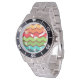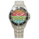 This watch has a 1970s retro design of horizontal zigzag lines in yellow, orange, red, green, and blue on a field of brown.