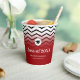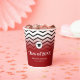 This graduation paper cup features classic black and white zigzags as the background accented with a dark red gradient colour. This design is accented with a mortarboard above the text.
