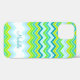 Modern zig zag patterned iphone cover in teal, green, yellow and blue hues. Customise this bold patterned iphone case cover with your name and your family initial or monogram. Currently reads Michelle R. Ideal personalised gift for girls and women. Design by Sarah Trett. www.sarahtrett.com See the whole range of iphone cases and covers here