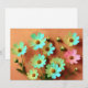 This vibrant botanical study celebrates the Zinnia elegans , rendered in a loose, expressive style that captures both natural beauty and artistic interpretation. Turquoise, buttercup yellow, and soft pink petals radiate from rich brown centres, contrasting boldly against a warm, earthy backdrop of terracotta and burnt sienna. The textured brushstrokes evoke a sense of movement, as if the flowers sway gently in a sunlit garden.