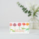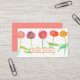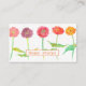 A cheerful business card decorated with five zinnia flowers in shades of red, pink, orange, and purple painted with watercolor and touches of spatter in the background for added colour. In the Language of Flowers zinnias mean thoughts of absent friends. Eye-catching colours for networking and your business promotion.
