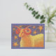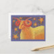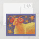 Aries the ram stands against a night sky filled with golden stars. Fire sign, March 21 - April 20 (there may be a variation in the dates). Postcard with a gold, orange, purple and blue customisable design on the front for you to personalise with your own text, images and ideas. An original coloured pencil and metallic ink drawing by Jess Perry.