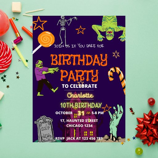 Transform your birthday into an unforgettable celebration for both you and your guests with this lively and colourful design featuring zombies, mummies, graveyards, sweets, and more. Easily personalise it with your details, and you're ready to go. Enjoy your birthday party