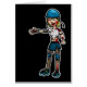 Watch out. The Zombies are coming. They want the brains of all living humans and Roller Derby Girls are no exception! Looks like they got one too, and now she's Hell on Wheels! Better watch out! A cartoon zombified Roller Derby girl in a blue, black and white uniform covered in blood and missing several chunks. She is missing an arm and is wearing a cracked Derby Helmet.