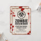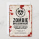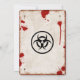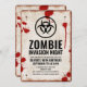 Vintage look invitation for a zombie invasion themed party with a rusty warning sign, biohazard symbol and blood stains.