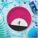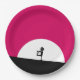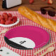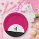 Paper plates with a cool zombie dude. Pink and black bold vibrant colour scheme.  A zombie silhouette with arms outstretched on the hunt for brains. A big white moon illuminates from behind.