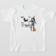 This shirt features a realistic image of a woman zombie skeleton walking with three black bats hovering about. A bright orange jack-o-lantern shines at her feet. The stylised text says NEED MORE CANDY in black and red. Cute, with just enough scary for kids or anyone!