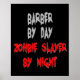 This eerie text design featuring the quote "Barber by Day Zombie Slayer by Night" in blood red writing, is perfect for any barber that loves zombies.