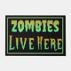 the warning "Zombie Live Here" printed in a creepy, horror style, oozing neon green and orange.