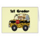 Zoo animals including a zebra, monkey, giraffe, and hippo ride the yellow school bus to 1st grade on our Zoo Animals 1st Grade T-shirts, mugs, cards, stickers, tote bags, sweatshirts, and other first grade gear.