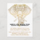 Unique, boho tribal elephant zoo birthday party invitations- Beautiful, faux metallic gold, tribal elephant with henna pattern tattoos. Reads Le'ts Go Wild for with personalised name and birthday year in bold black and white lettering. Below is personalised zoo party details, including RSVP information in matching, gold colour whimsical letter style. Blank on back to add whatever message you like, whether printed or handwritten. One of a kind, wild animals zoo invitations.