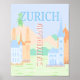 This design is a charming, pastel-hued illustration inspired by Zurich, Switzerland. The composition features a soft, blue, and green background, evoking the serene and scenic beauty of the Swiss Alps, depicted with mountain silhouettes. Prominent architectural elements such as Zurich's iconic church towers are stylised in pastel blues and oranges, giving the illustration a whimsical feel.
